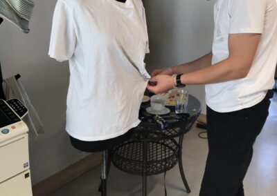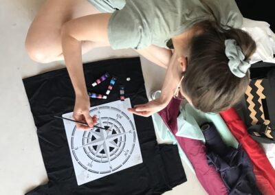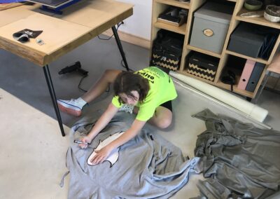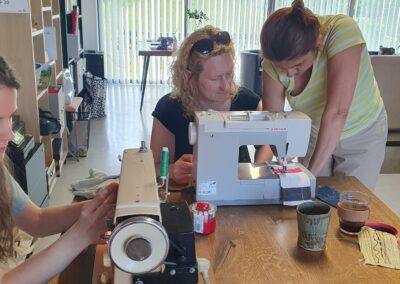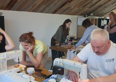 Warsztat 3. Farbowanie ubrań ekologicznymi barwnikami oraz dalsze doskonalenie umiejętności szycia na maszynie. Uczestnicy warsztatów zdobyli wiedzę na temat naturalnych barwników, które można wykorzystać do odnawiania czy odświeżania ubrań przez ich farbowanie. Uczestnicy doskonalili też umiejętności szycia na maszynie.