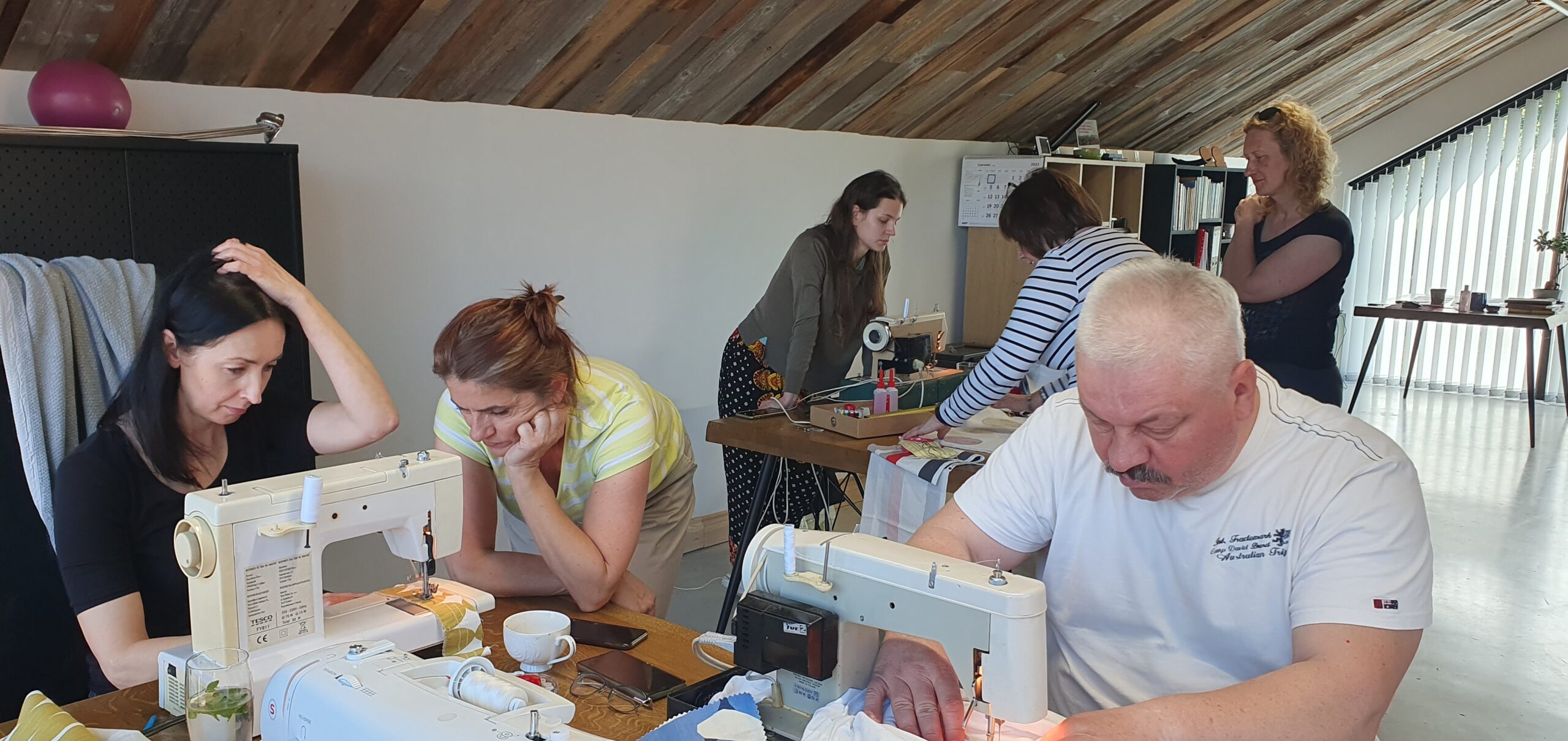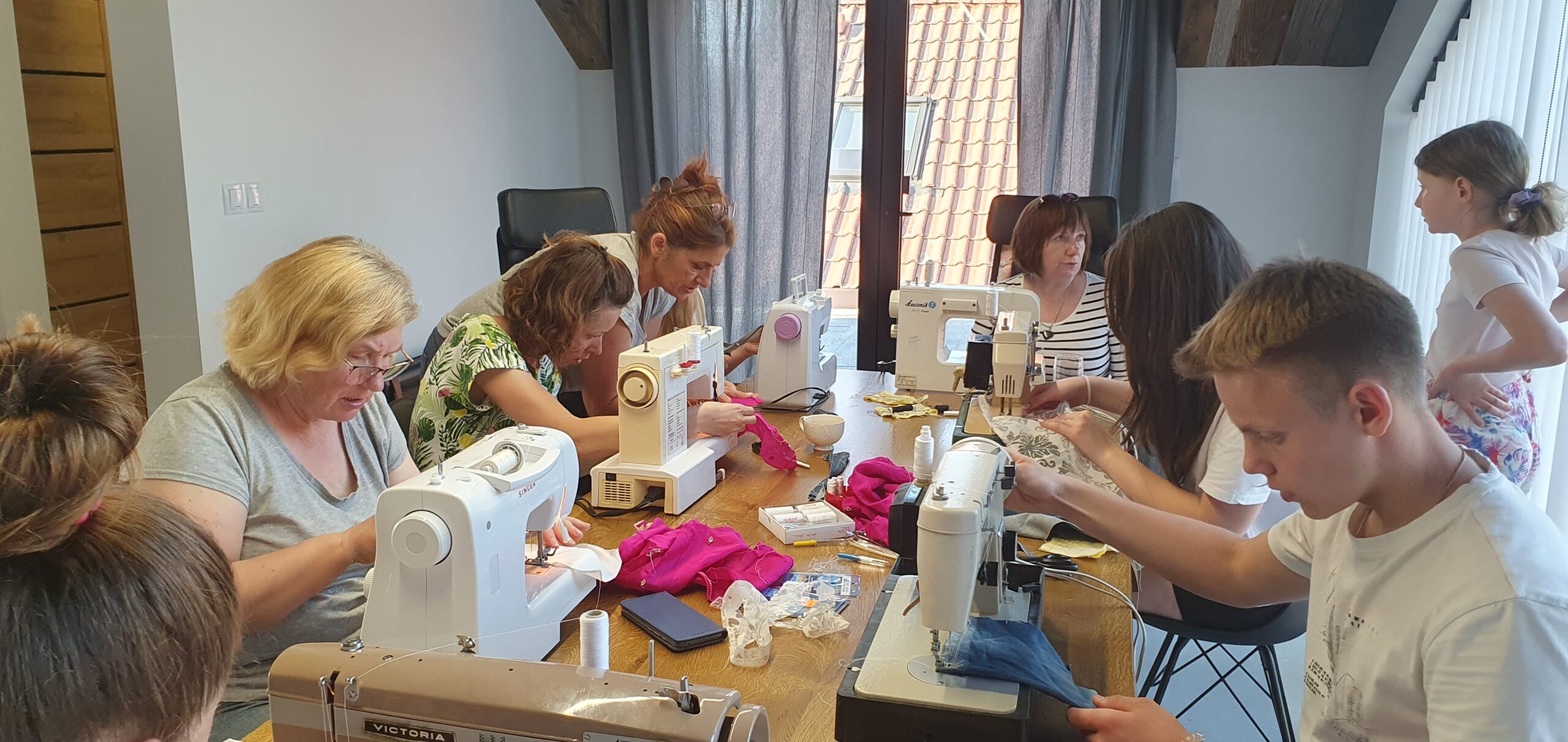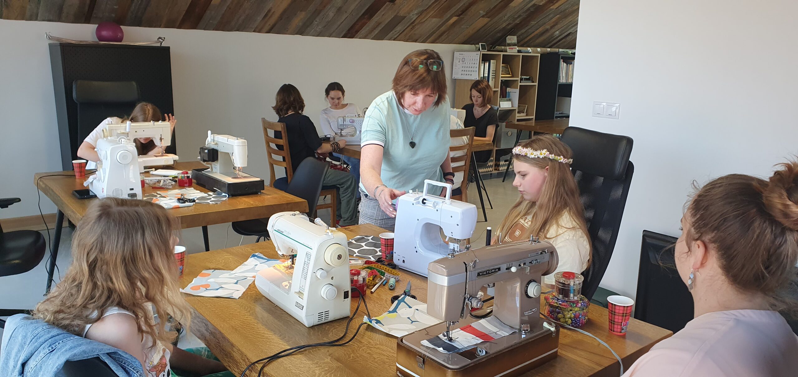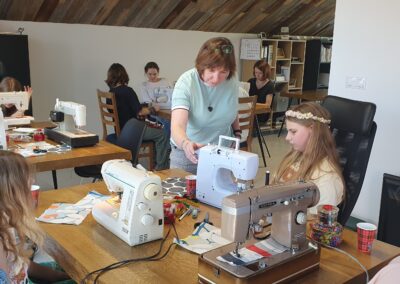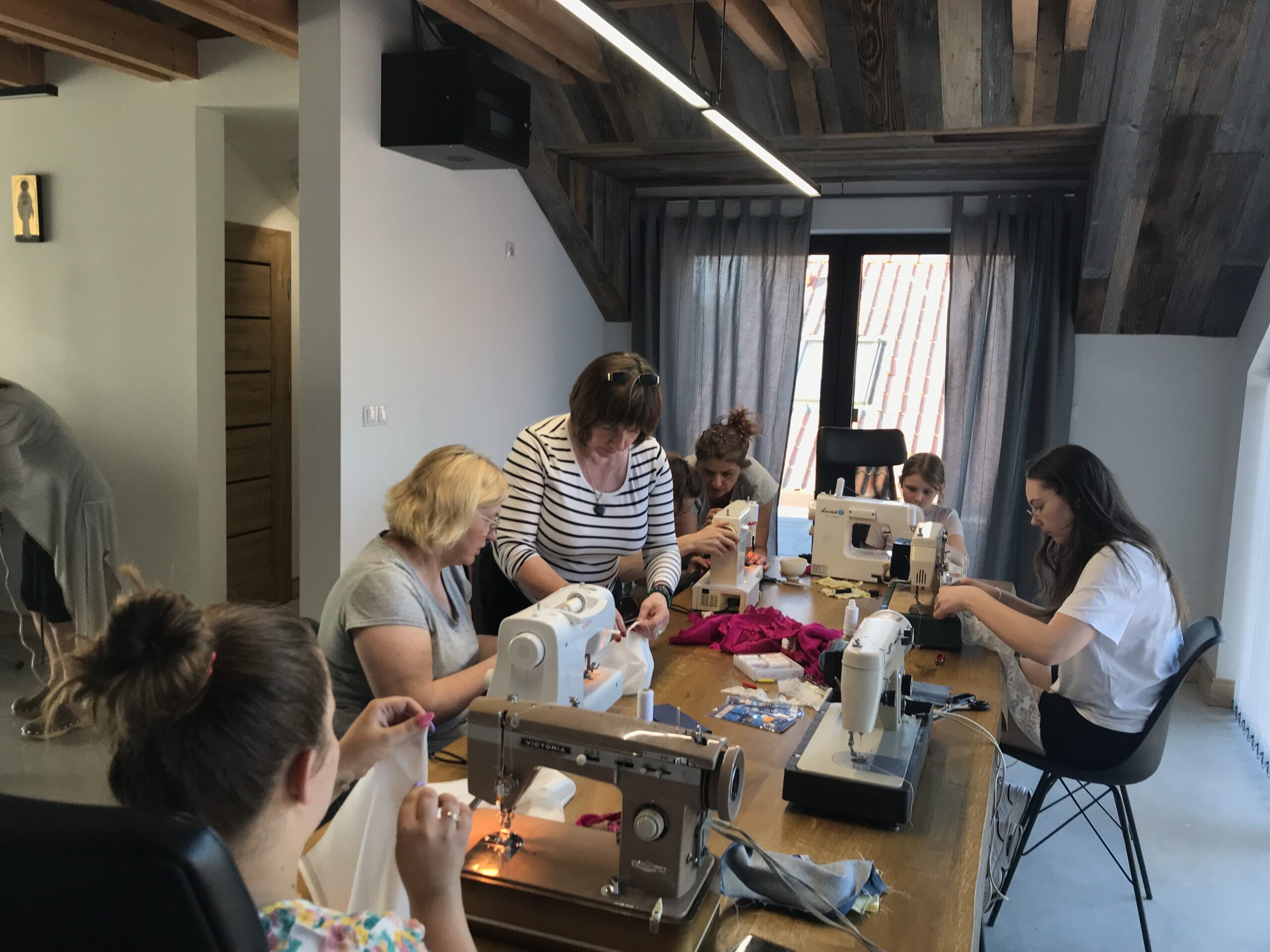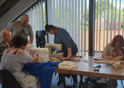 Warsztat 2. Doskonalenie umiejętności szycia na maszynie i szycia ręcznego. Uczestnicy doskonalili umiejętność szycia na maszynie. W ramach wymiany międzypokoleniowych doświadczeń wybrani członkowie lokalnej społeczności podzielili się z uczestnikami warsztatów tajnikami szycia za pomocą igły i nitki.