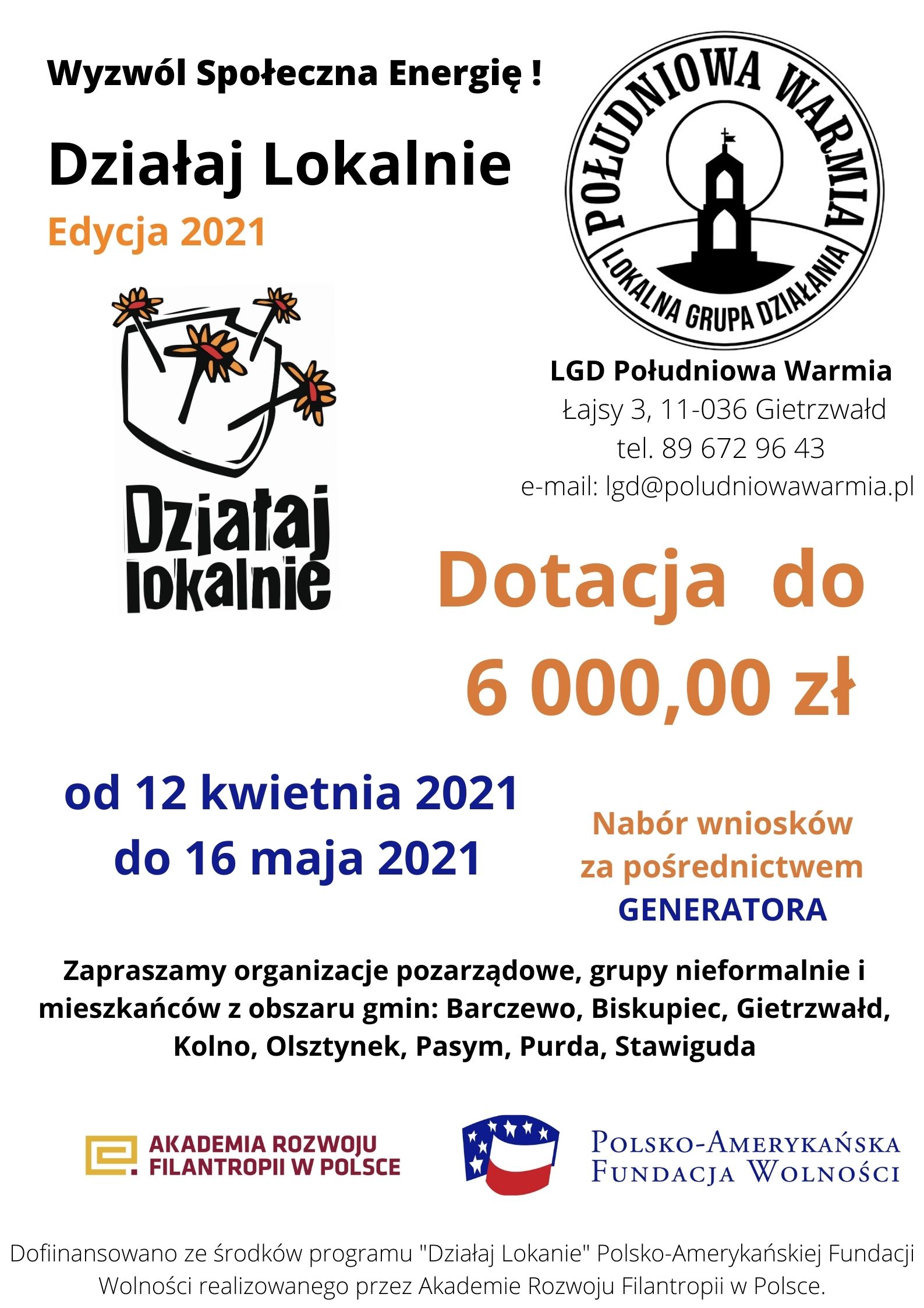 Nabór wniosków do tegorocznej edycji konkursu rozpoczyna się 12 kwietnia 2021 r. i potrwa do 16 maja 2021 roku. Wysokość grantu, o który można wnioskować to 6000 zł, a długość trwania projektu, od 3 do 6 miesięcy. W konkursie „Działaj Lokalnie” wspierane będą projekty, które inicjują współpracę mieszkańców na rzecz dobra wspólnego i które służą pobudzaniu aspiracji rozwojowych, poprawie jakości życia. W rezultacie podejmowane działania mają przyczyniać się do budowania lokalnego kapitału społecznego. Program jest prowadzony z myślą o organizacjach pozarządowych oraz grupach nieformalnych, które podejmują wspólny wysiłek, aby w ich społecznościach żyło się lepiej.
