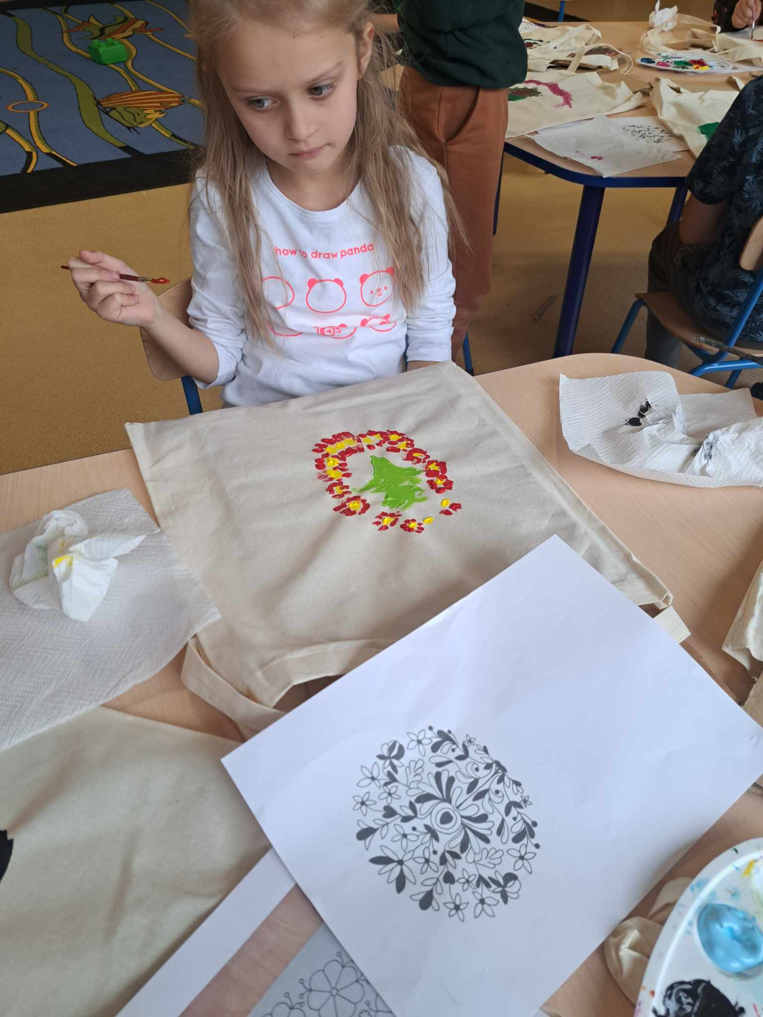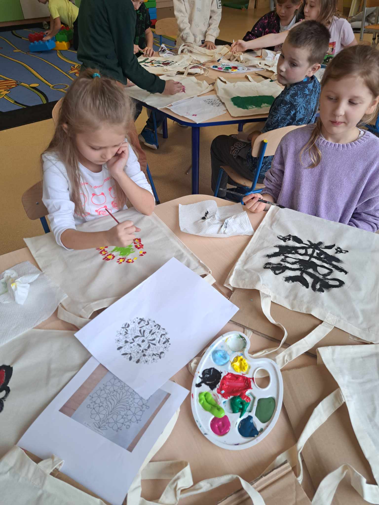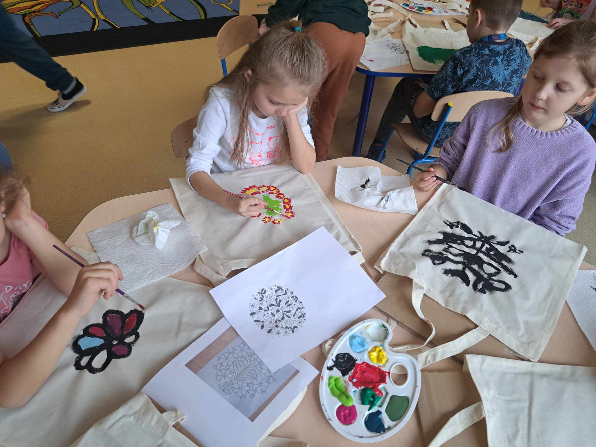 Kolejnym warsztatem było malowanie eko toreb, podczas którego uczestnicy własnoręcznie ozdabiali tkaniny, tworząc niepowtarzalne, etniczne wzory obu regionów. Warsztaty odbyły sie w świetlicy w Bartągu dnia 14,11,2 o godzinie 11:00. Liczba czynnych uczestników 51 . Dodatkowo, odbyły się warsztaty tkackie, gdzie dzieci uczyły się tkania makatek na krosnach. Warsztaty odbyły się 26.09.2023 o godz. 15.00. Podczas każdego spotkania przekazywano także dzieciom kilka zwrotów warmińskich i mazurskich, opowiadając o historii i tradycjach regionów.